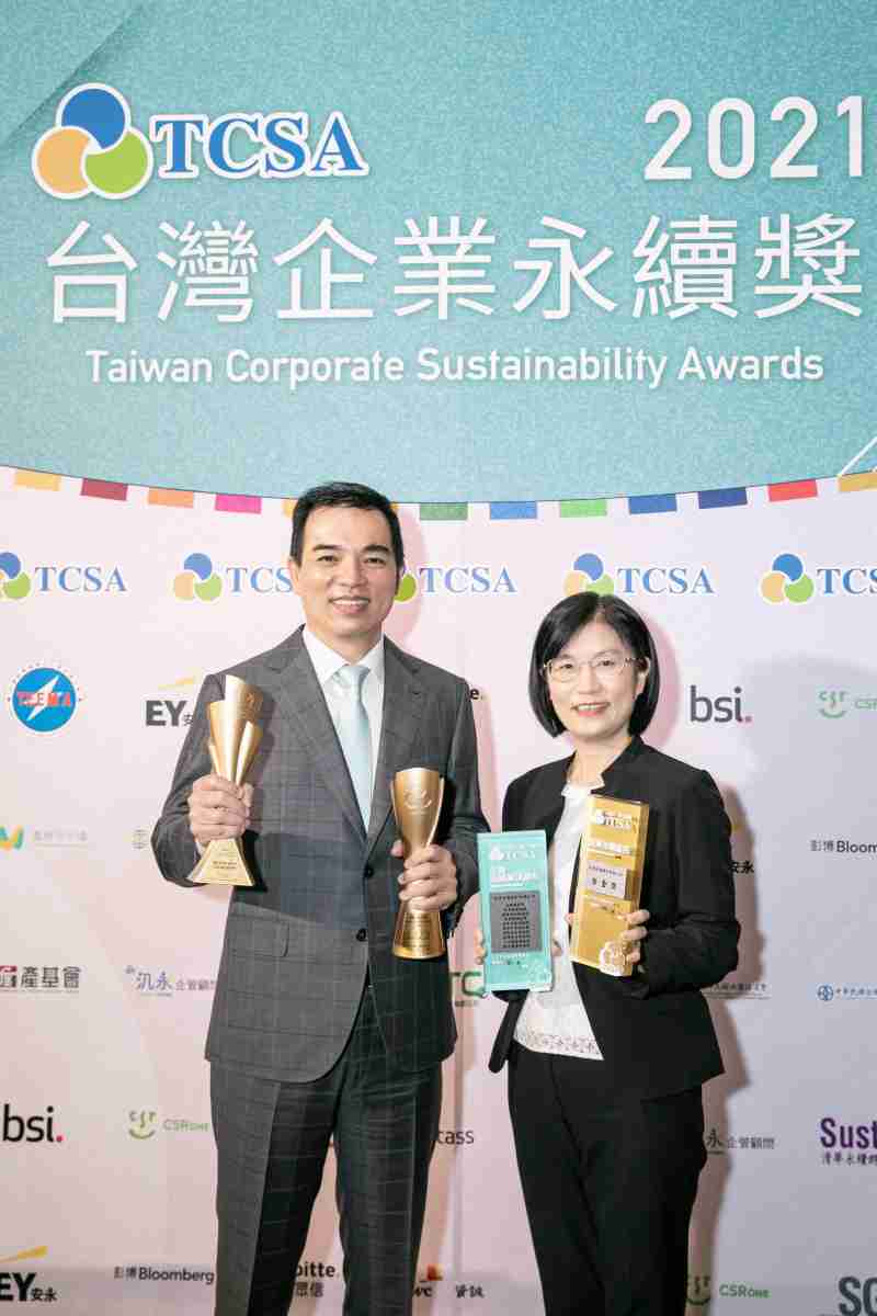 达在台湾永续奖所评比环境、、社会、、治理等各面向的永续绩效均获高度肯定 (左:尊龙集团光电总经理暨营运长柯富仁,,,,右:尊龙集团光电永续长古秀华)