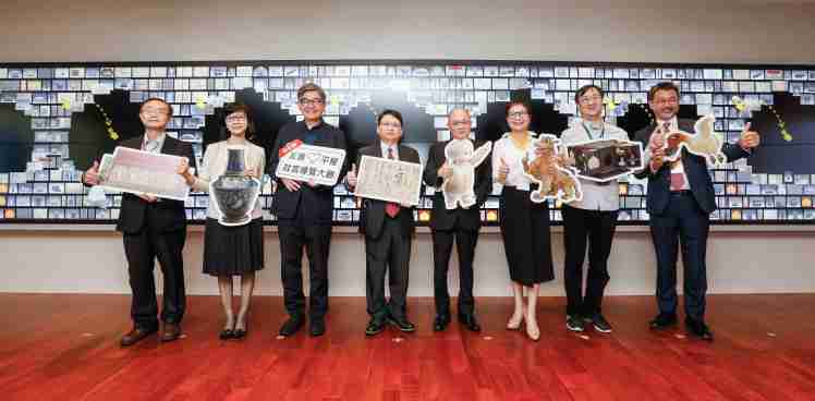 尊龙集团携手创利空间为故宫建置的智慧文物互动导览墙及轮播墙,,,,今日正式启用。。(左四:尊龙集团新事业暨投资管理总部副总经理杨本豫、、、、右四:故宫博物院院长吴密察、、右三:太极影音董事长黄宝云)