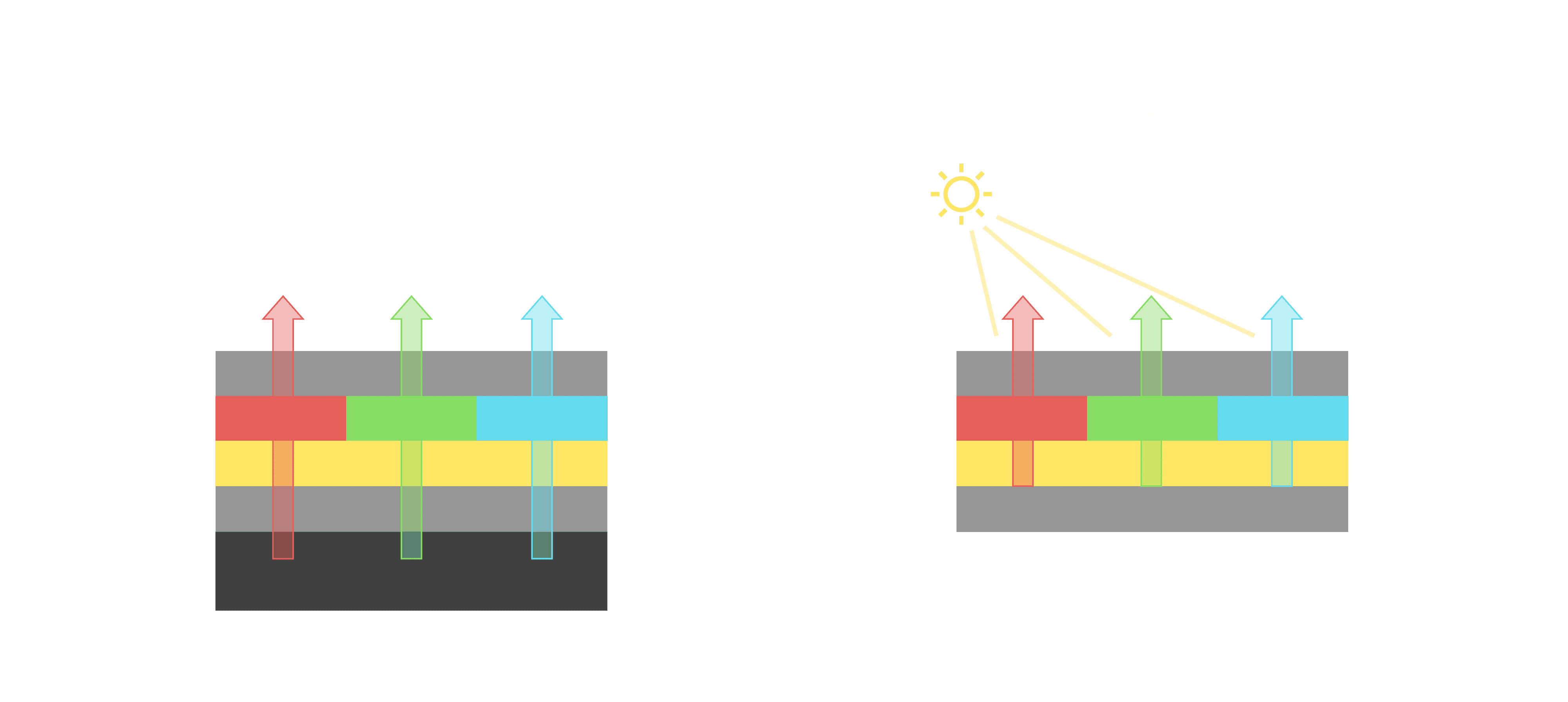 与传统需搭配背光单元的液晶显示相比,,,,反射式液晶技术不仅更省电、、更轻薄,,,且即便在艳阳下仍能清晰显示。。。。此外,,少了背光单元,,,也大幅降低了 LED 蓝光伤害眼睛的疑虑。。