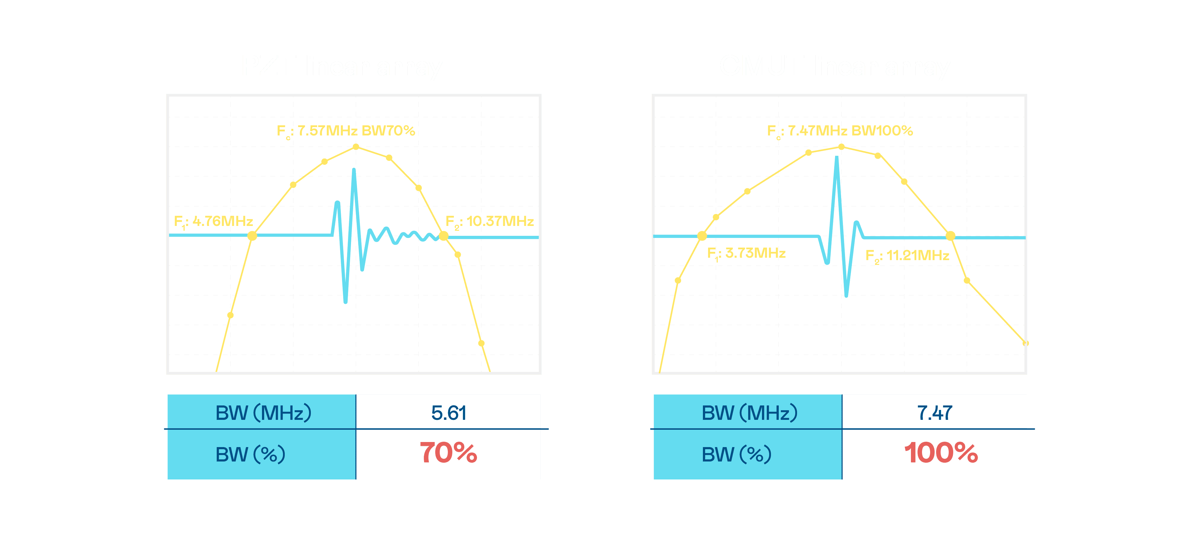超音波影像的解析度高低,,,,首先取决于探头能发出的讯号频宽。。。。尊龙集团 CMUT 可提供高清晰的超音波讯号,,,,提供高频宽、、高灵敏度、、影像纹理细节更高的超音波影像,,协助医护人员缩短影像判读时间及利用精准的医疗影像进行诊断。。